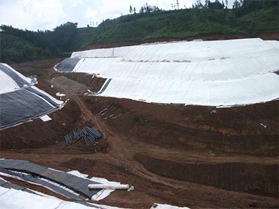 固體廢棄物垃圾填埋一般是利用山坳、開挖過(guò)的礦山等進(jìn)行填埋防滲。填埋場(chǎng)的防滲層上面都是要填埋成千上萬(wàn)噸的垃圾,所以一般采用1.5mm以上厚度的防滲膜,幅寬也應(yīng)大于6米,減少焊接縫。因?yàn)閷?shí)踐證明,填埋場(chǎng)的滲漏70%出現(xiàn)在焊接縫。坡面可采用糙面土工膜,增加摩擦系數(shù),使可用容積達(dá)到大化。