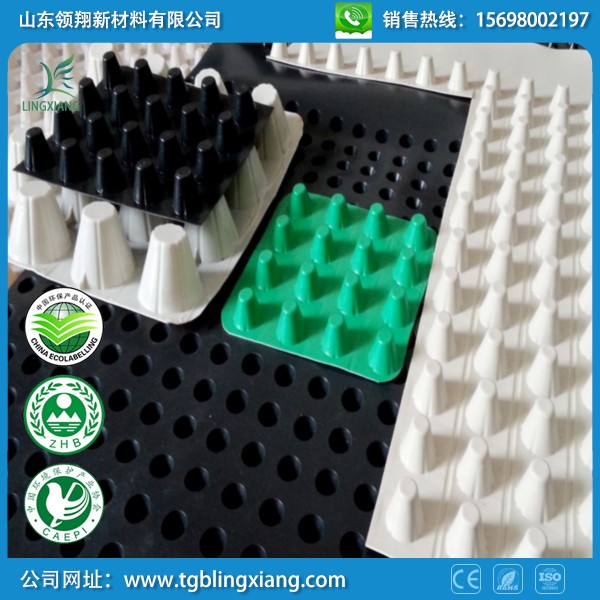 用于種植屋頂的還有排蓄水板,他的形狀是雙面有凸點,上表面覆在土工布濾水層,下凹的點有蓄水作用,多的水從上凸點間排走。