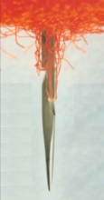 利用三角截面(或其它截面)棱邊帶倒鉤的刺針對纖網(wǎng)進(jìn)行反復(fù)穿刺。倒鉤穿過纖網(wǎng)時(shí),將纖網(wǎng)表面和局部里層纖維強(qiáng)迫刺入纖網(wǎng)內(nèi)部。由于纖維之間的摩擦作用,原來蓬松的纖網(wǎng)被壓縮。刺針退出纖網(wǎng)時(shí),刺入的纖維束脫離倒鉤而留在纖網(wǎng)中,這樣,許多纖維束糾纏住纖網(wǎng)使其不能再恢復(fù)原來的蓬松狀態(tài)。經(jīng)過許多次的針刺,相當(dāng)多的纖維束被刺入纖網(wǎng),使纖網(wǎng)中纖維互相纏結(jié),從而形成具有一定強(qiáng)力和厚度的針刺法非織造材料。