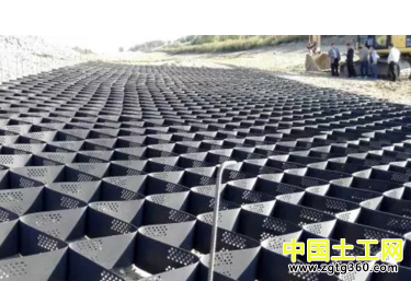 以上所舉的這些例證多是利用土工格室提高承載能力。其實,土工格室的另一個重要作用是控制沖蝕,而且在國外使用土工格室控制沖蝕的應用量絲毫不亞于承載應用。應用多的有護坡、堤壩、擋土墻、防波堤岸等等。它的原理就是增加流動能力,減少毛溝侵蝕,防止水壓積聚、消除集中沖蝕。蜂窩限制結構可以固定填充材料,限制作用于其上的水壓,從而改善了流動能力。蜂窩壁使正常的排水可以進行,但卻控制了窩內(nèi)的流動速度。如同千百個微型堤壩,將集中水流分散成均勻、舒緩的薄層水流。